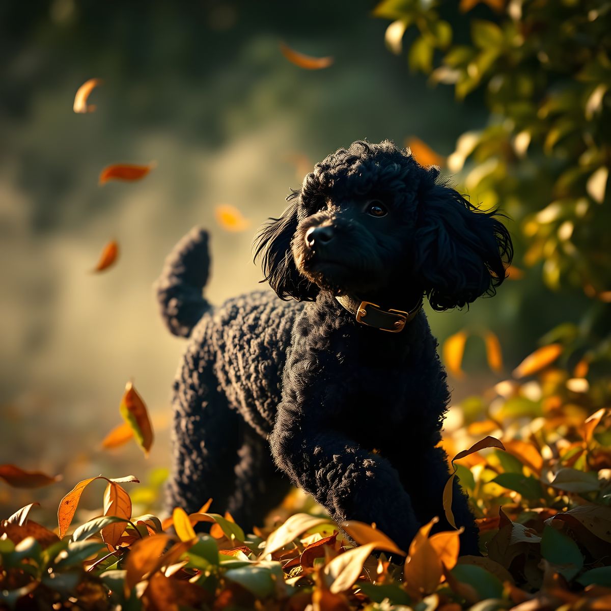 A cinematic film still of a black poodle playing in a garden, surrounded by swirling leaves in a rich, golden color palette, captured in vibrant, hyper-realistic detail