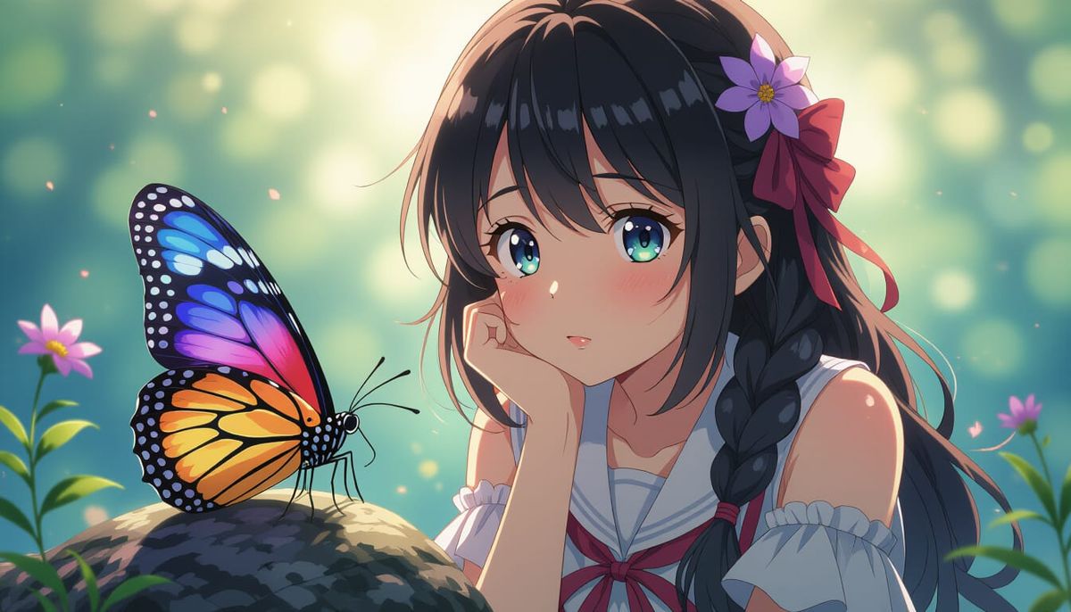 A striking picture of an anime-style character observing a butterfly. The image is rendered in high definition with vibrant colors and textures, in a CGI aesthetic.