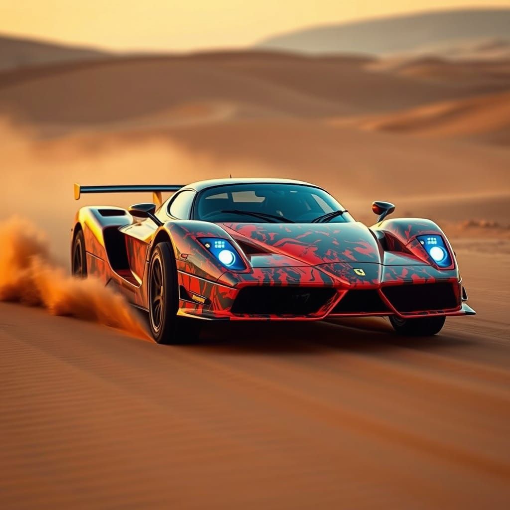 This image shows a Ferrari Enzo with off-road suspension speeding across desert dunes. The car features cyberpunk-style LED headlights and a desert camouflage holographic paint job, captured with a drone chase cam.