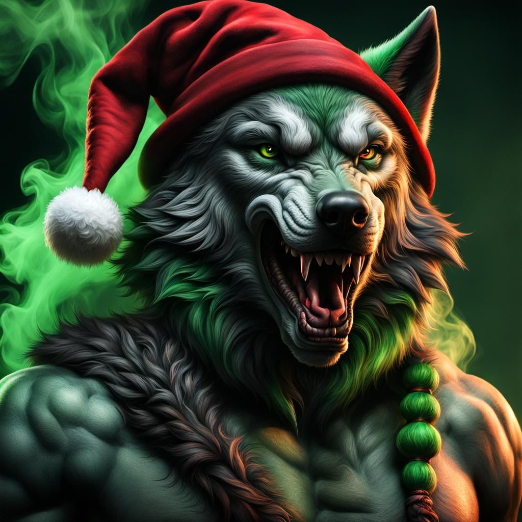 This image shows a muscular, anthropomorphic wolf-man wearing a Santa hat and Viking pants. Dark green and red smoke billows around him, illuminated by intense light green mist. A 3D render with intricate details.