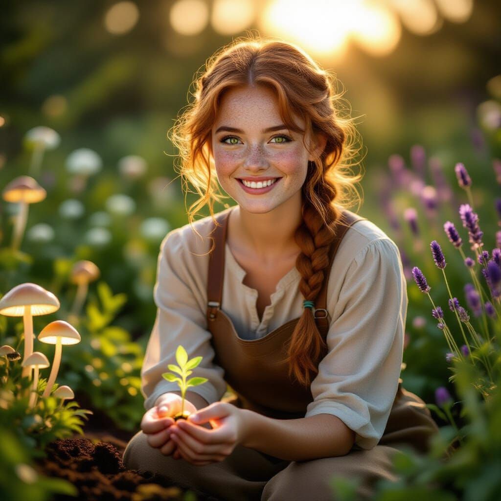 A photorealistic image of a smiling young witch with green eyes in a magical garden at golden hour. She holds a glowing seedling, surrounded by bioluminescent plants, captured with cinematic lighting.