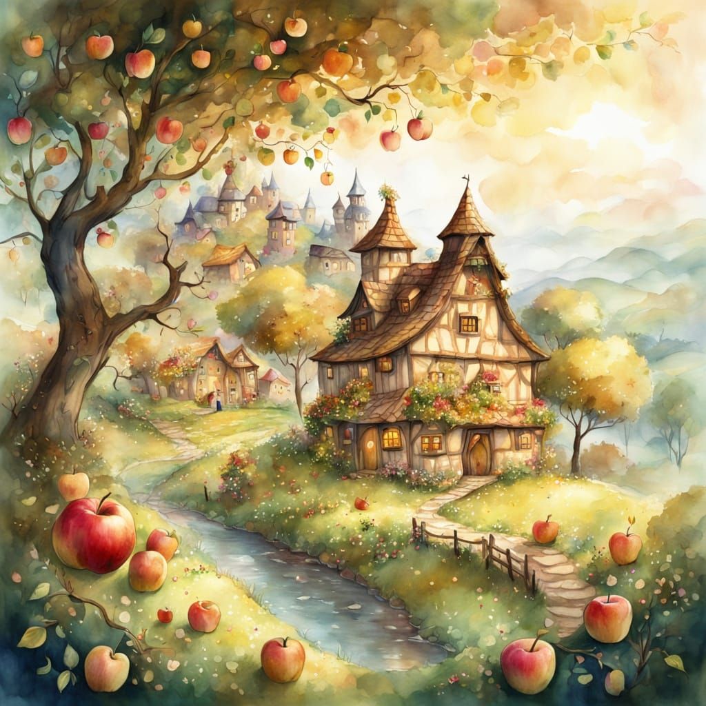 This image shows a cozy village inside an apple. The scene is a watercolor illustration with soft brushstrokes, gentle light, and warm golden colors, creating a dreamy and peaceful atmosphere.