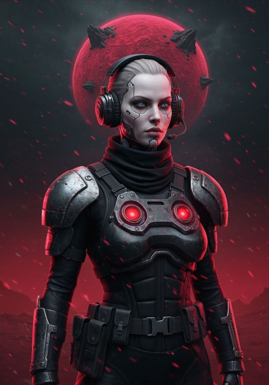 A striking picture of a cyborg soldier in a desolate alien world. She wears tactical armor and industrial headphones, with a massive red planet looming in the background. Rendered with cinematic lighting and a gritty, hyperdetailed aesthetic.