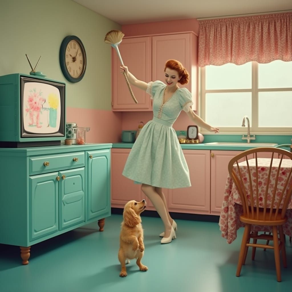 This image shows a vintage 1950s scene of a housewife dancing with her mop in a pink and aqua kitchen. A dog dressed as a child watches her from a table, with an old teal TV in the background.
