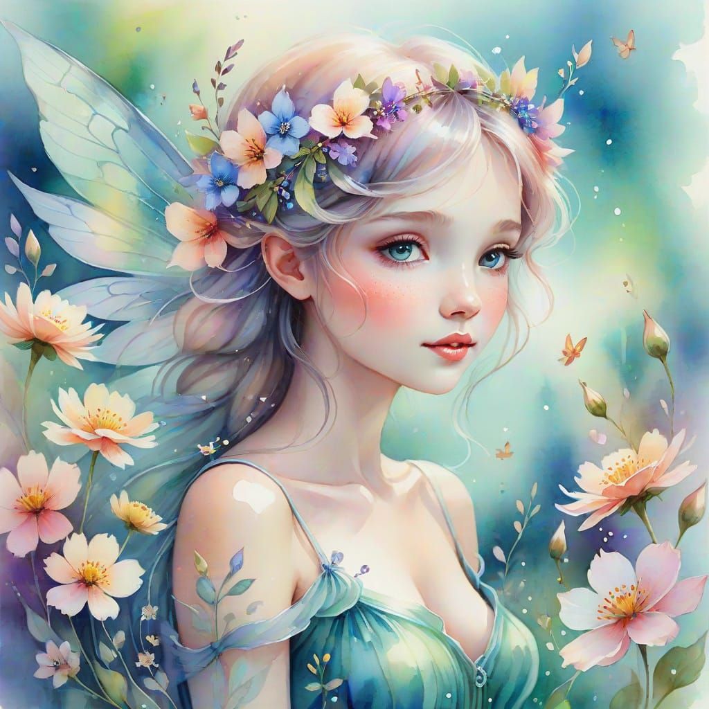 A close-up image of a fairy with flowers in a whimsical fantasy scene. Rendered in watercolor style, it features transparent petals, delicate wings, and gentle pastel lighting.