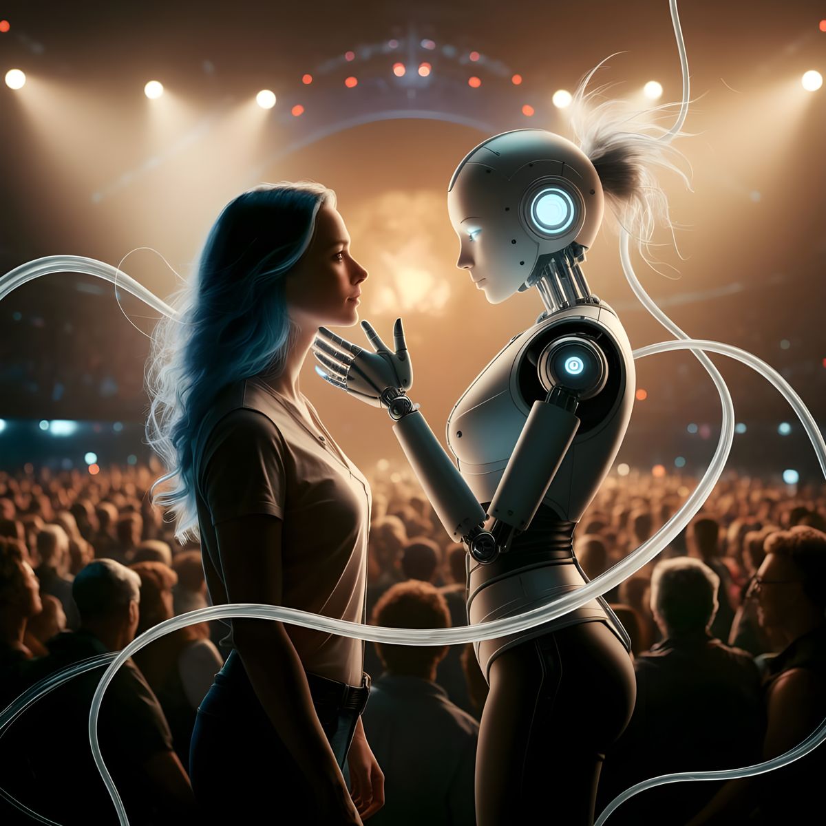 This image shows a person named Becky entranced by their AI girlfriend at a Metallica concert. The AI's glowing eyes and luminescent tendrils create a serene and alluring scene against the vibrant concert backdrop.