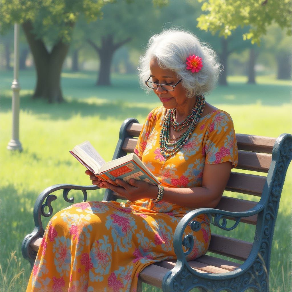 A peaceful image of an elderly woman with silver hair reading on a park bench. The soft, photorealistic watercolor art style evokes a dreamy and ethereal atmosphere.