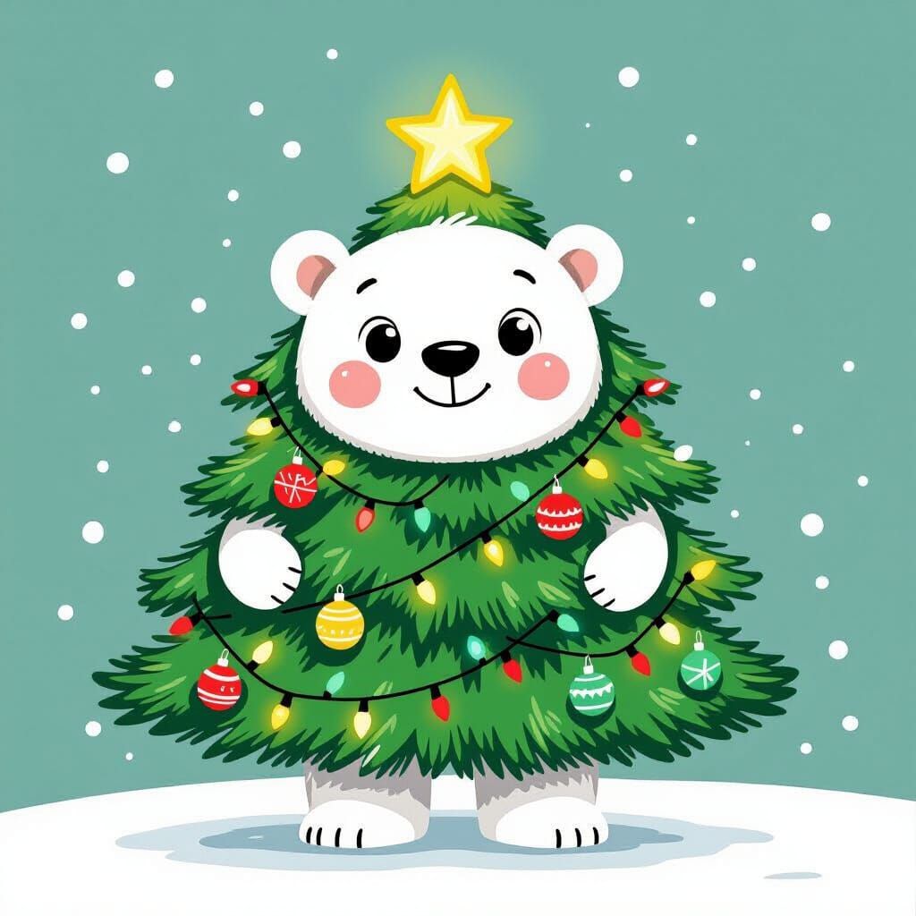 This image shows a cheerful cartoon polar bear dressed as a Christmas tree. The bear has big eyes, a friendly smile, and is adorned with colorful ornaments and glowing lights in a vibrant, glossy style.