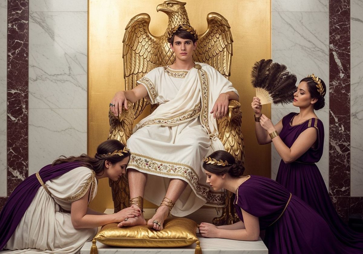 This image shows a young Roman emperor lounging on an ornate eagle-shaped throne in his private palace. Servants attend to him in the gold and white marble setting, captured with sharp focus and natural lighting.