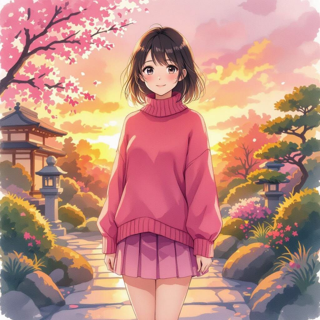 This image shows an anime girl in a pink outfit in a Japanese garden. The art style evokes soft watercolor textures and intricate details, reminiscent of anime masterpieces.