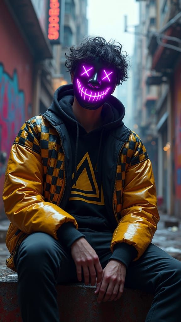 This image shows a cyberpunk figure with a neon mask sitting on a ledge in a futuristic alley. The figure is wearing a hoodie and jacket in a detailed, ultra-sharp 3D render. The art style is cyberpunk with intense colors.