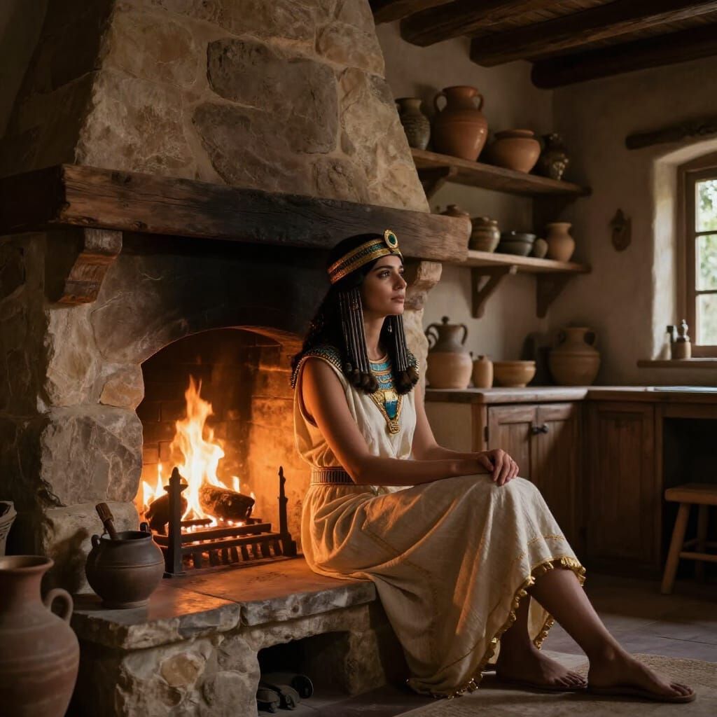 A striking image of Cleopatra, the Lady of Darkness, in a cozy rustic kitchen. Warm light from a stone fireplace creates a cinematic glow. Photographed with a DSLR, featuring sharp focus and natural lighting.