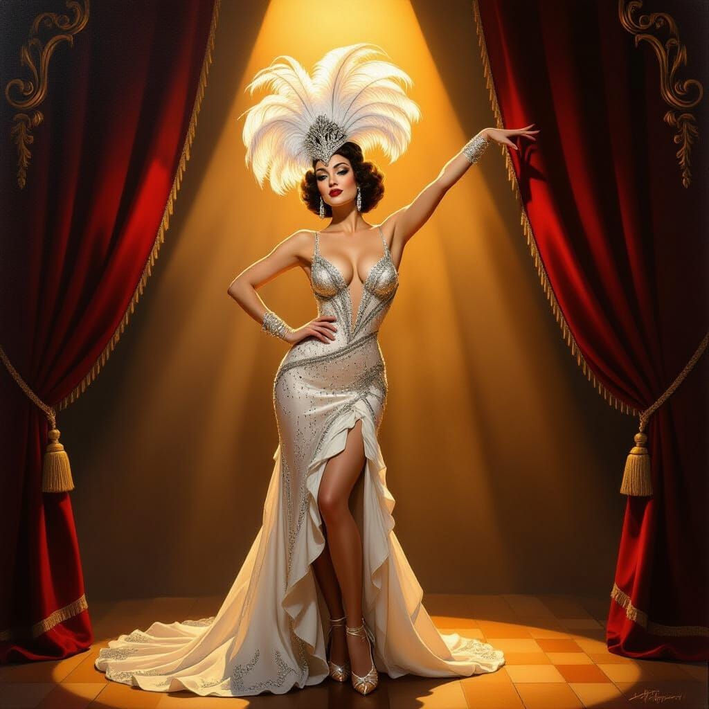 This image depicts a vintage cabaret dancer in a sequined gown and feathered headdress, posing under a spotlight. The artwork features a rich oil painting texture and dramatic lighting, evoking classic glamour.