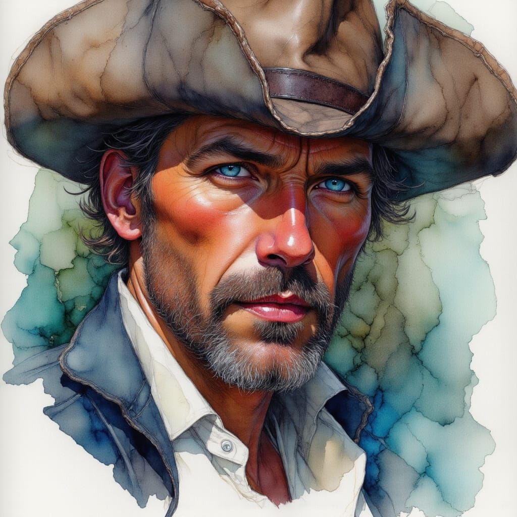 A striking close-up of a rugged pirate with piercing blue eyes. The image is a watercolor sketch with spring colors and dramatic lighting, in a painted style.