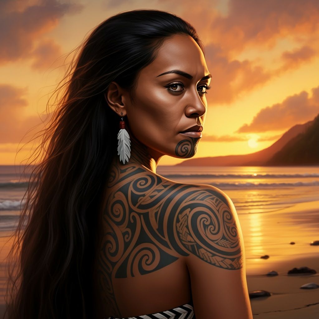 This image shows a beautiful Maori woman with traditional tattoos looking out at a serene beach landscape during sunset. Her features are sharp and her gaze is calm.