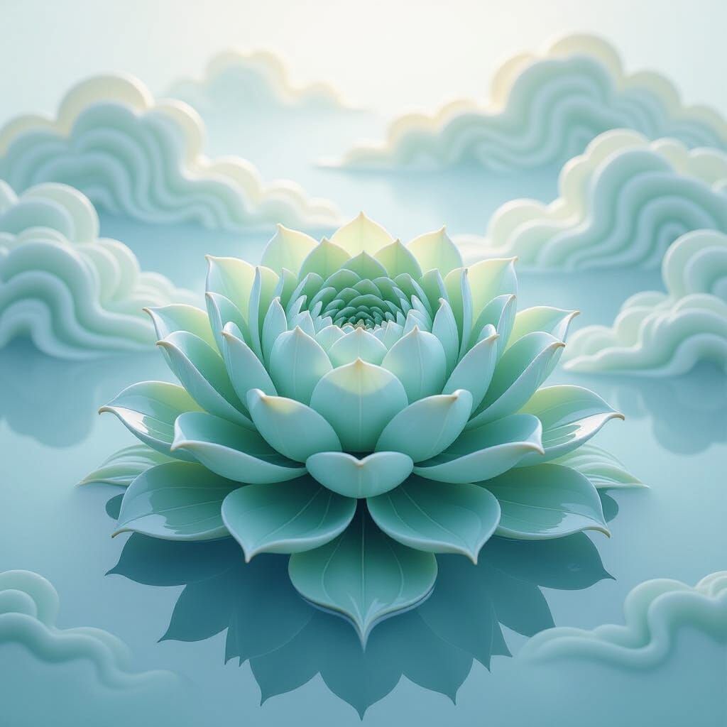This image showcases a meticulously carved jade lotus against swirling auspicious clouds, rendered in a watercolor mural style with blue and white tones, inspired by jade carving techniques.
