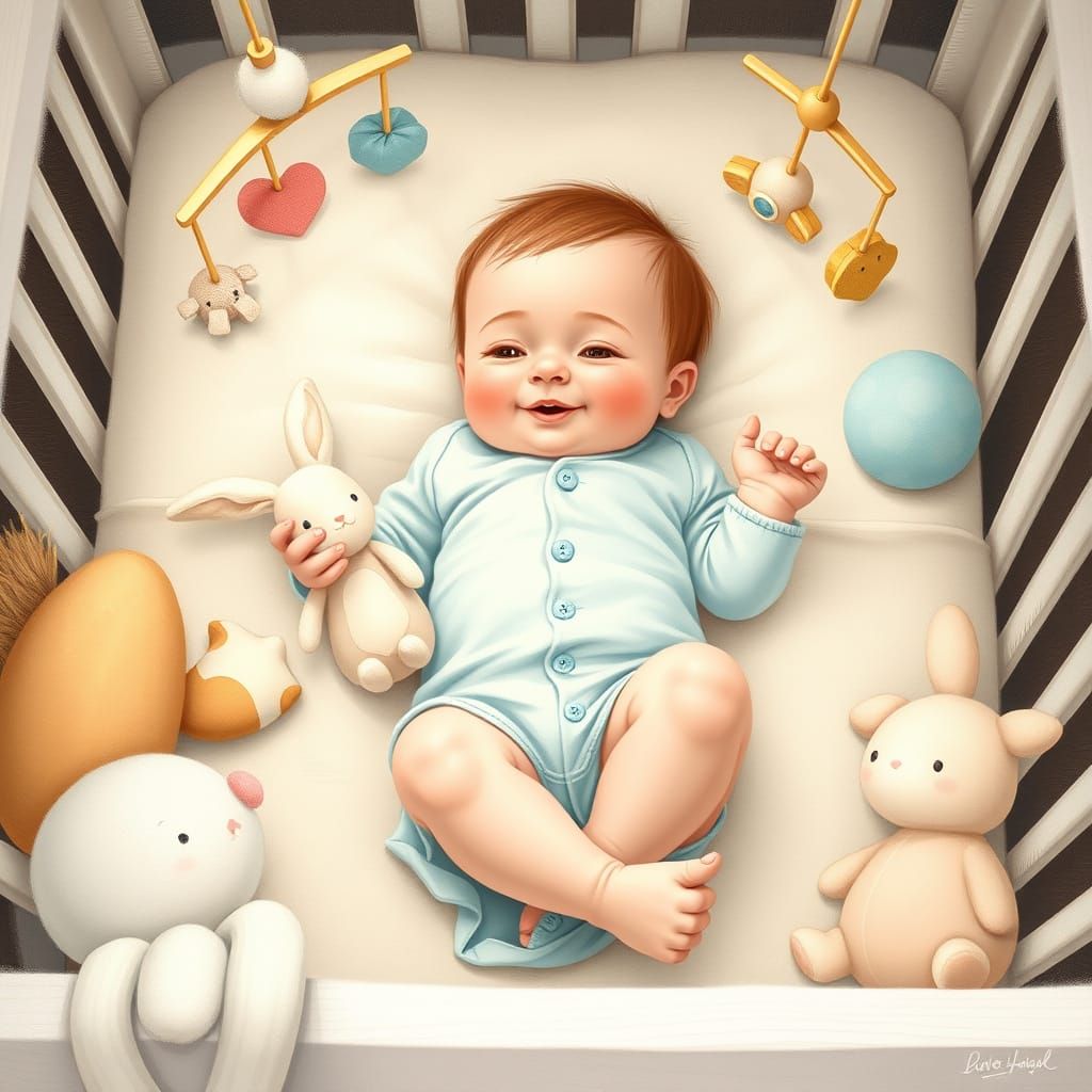 A sweet, snuggled baby boy lies in his crib, surrounded by plush toys and mobiles, playfully grasping a stuffed rabbit, in a style reminiscent of classic children's book art and dreamy, ethereal scenes