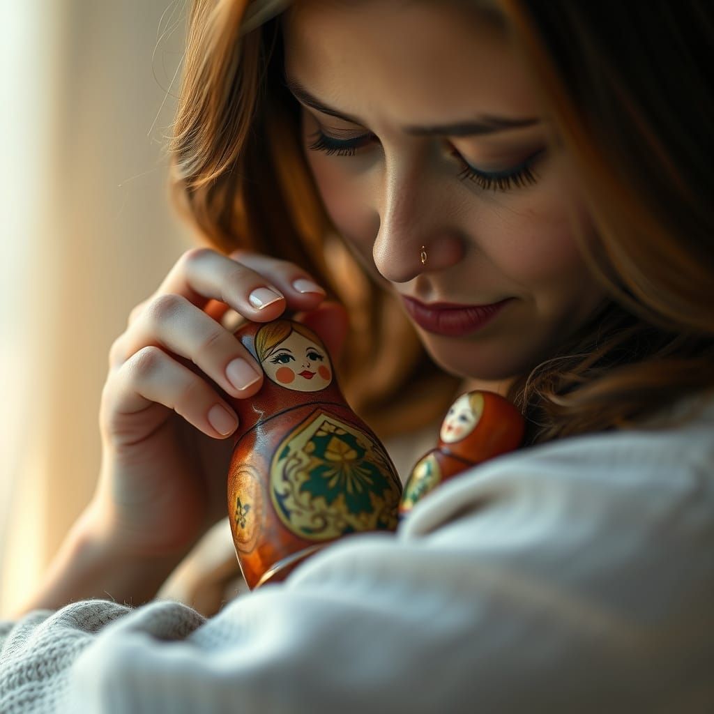 A serene portrait of a woman cradling an open Matrioska doll, surrounded by warm natural light, with a shallow depth of field and sharp focus on the intricate wooden craftsmanship, evoking a sense of intimacy and quiet contemplation