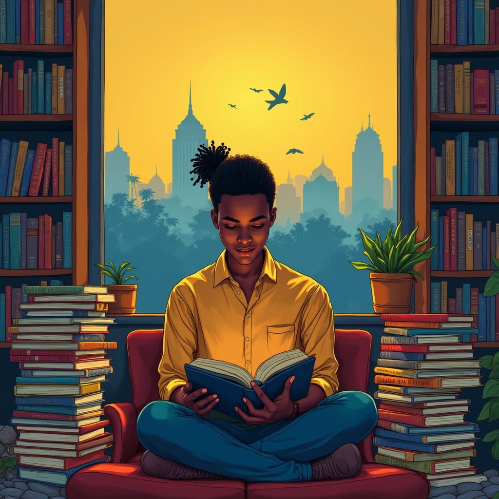 A vibrant image of a young Ethiopian book lover in a reading nook. The backdrop features Addis Ababa, while warm colors and detailed matte painting create a cozy, inviting atmosphere.