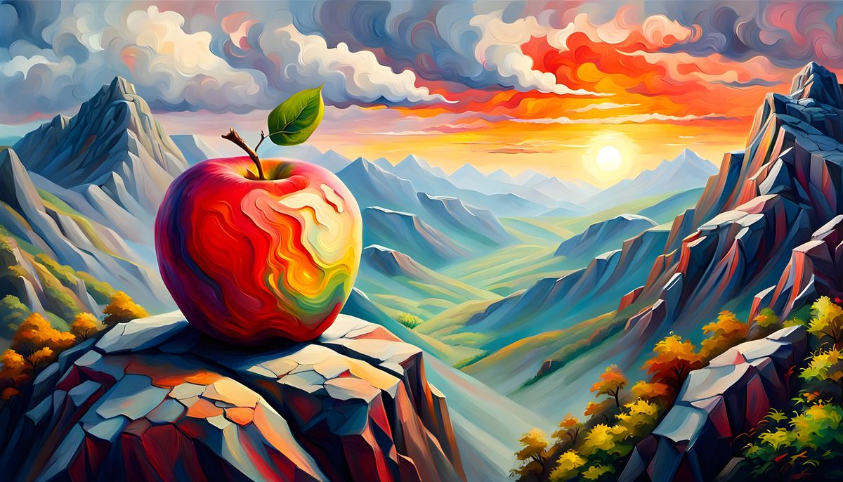 This image shows a gigantic apple situated in an unexpected location. The AI has interpreted the vague prompt to generate a surreal and slightly humorous scene.