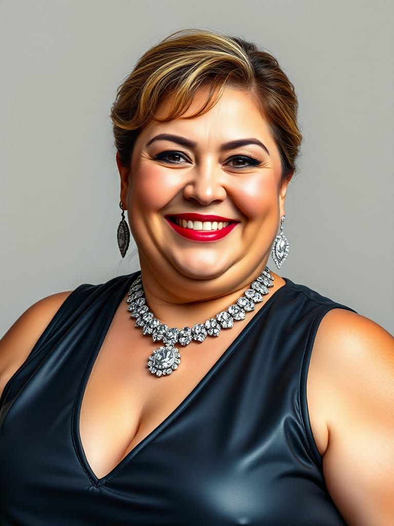 This image shows a close-up watercolor portrait of a confident, overweight 45-year-old woman. She is smiling and wearing a sleeveless black leather dress with diamond jewelry.