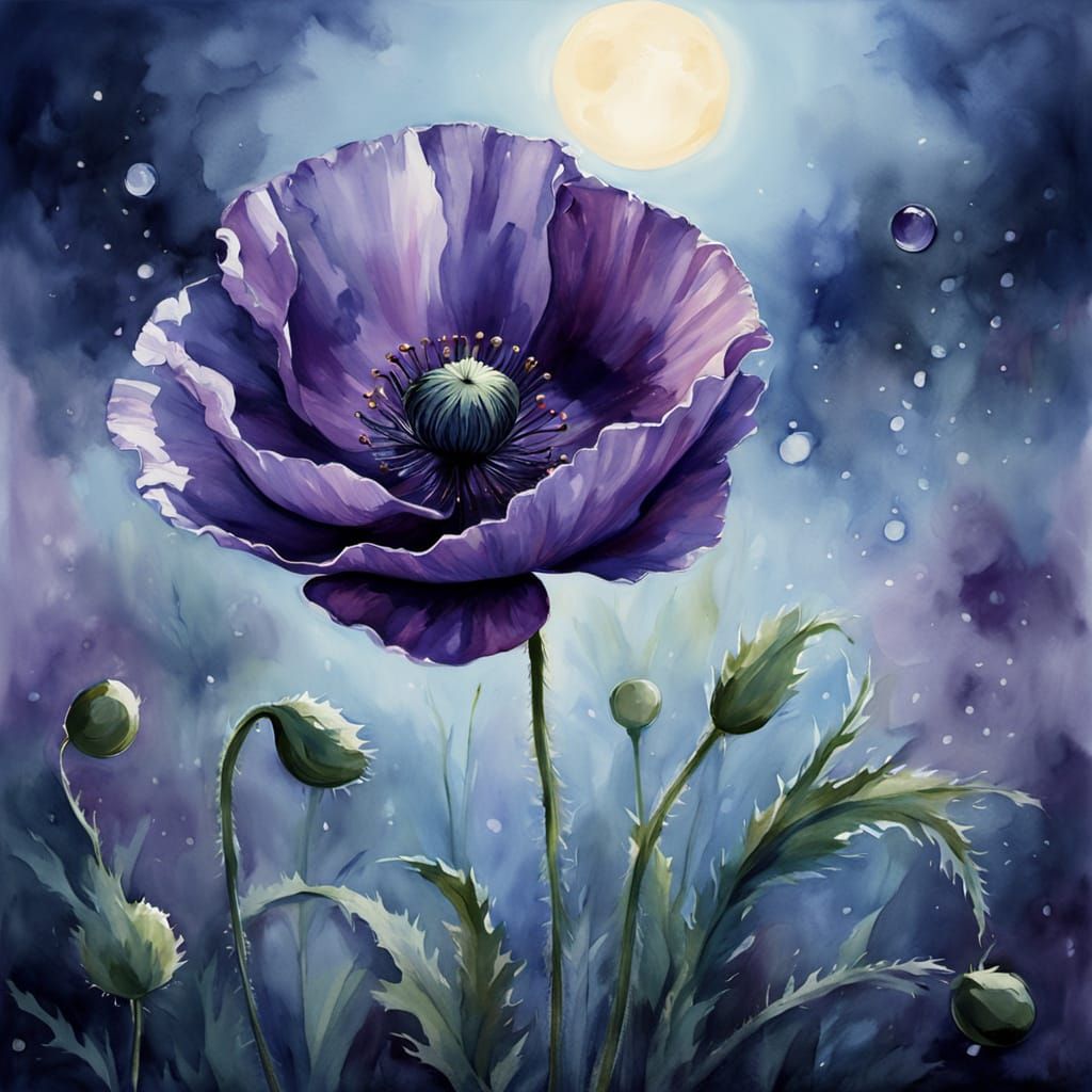 This image showcases a delicate watercolor painting of a single purple poppy bathed in soft moonlight. The ethereal style features subtle details and a gentle, glowing atmosphere.
