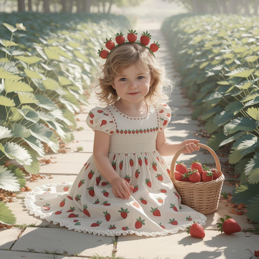 This image shows a sweet little girl in a sunlit garden, wearing a delicate strawberry-patterned dress and a whimsical strawberry crown, surrounded by soft pastel hues and intricate details capturing the warmth of the afternoon light.