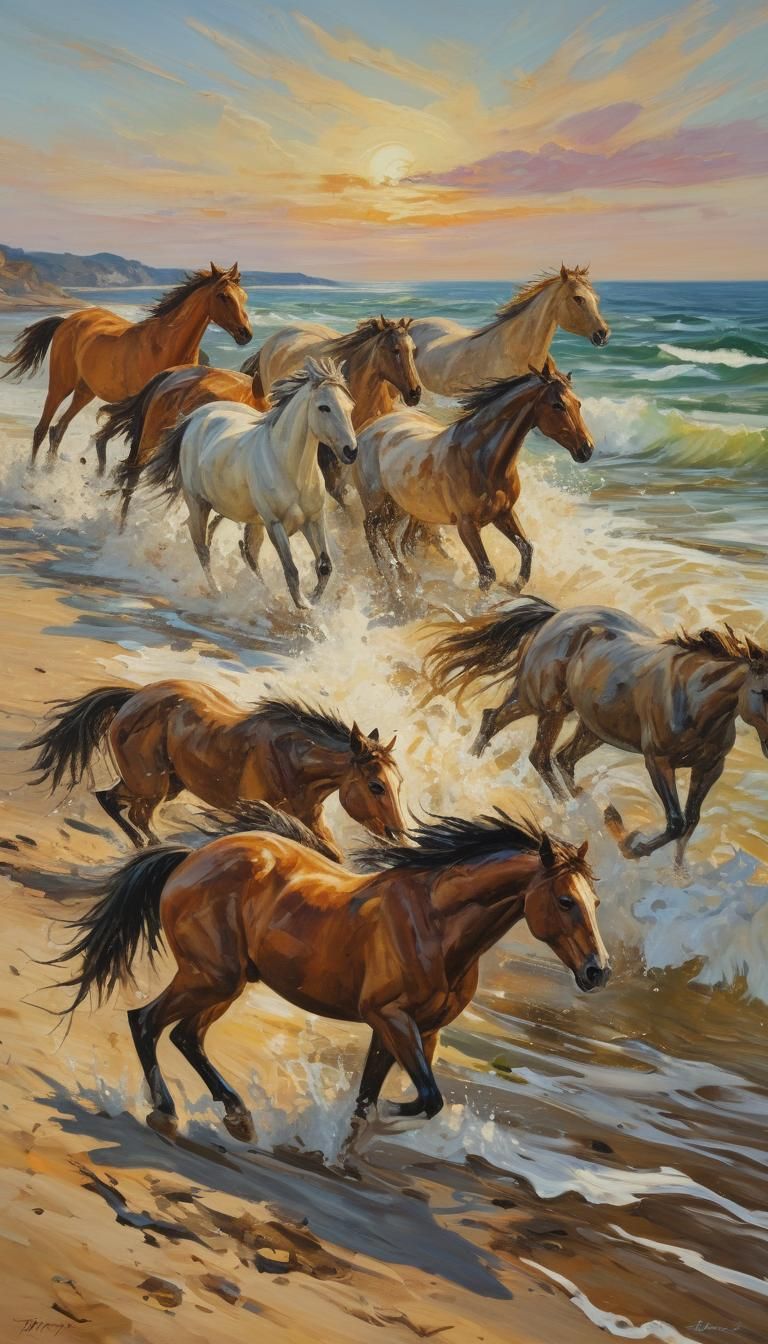 A vibrant expressionist painting of horses galloping along a seashore at sunset. Visible brushstrokes and bold colors capture the animals' dynamic movement, with driftwood in the foreground.