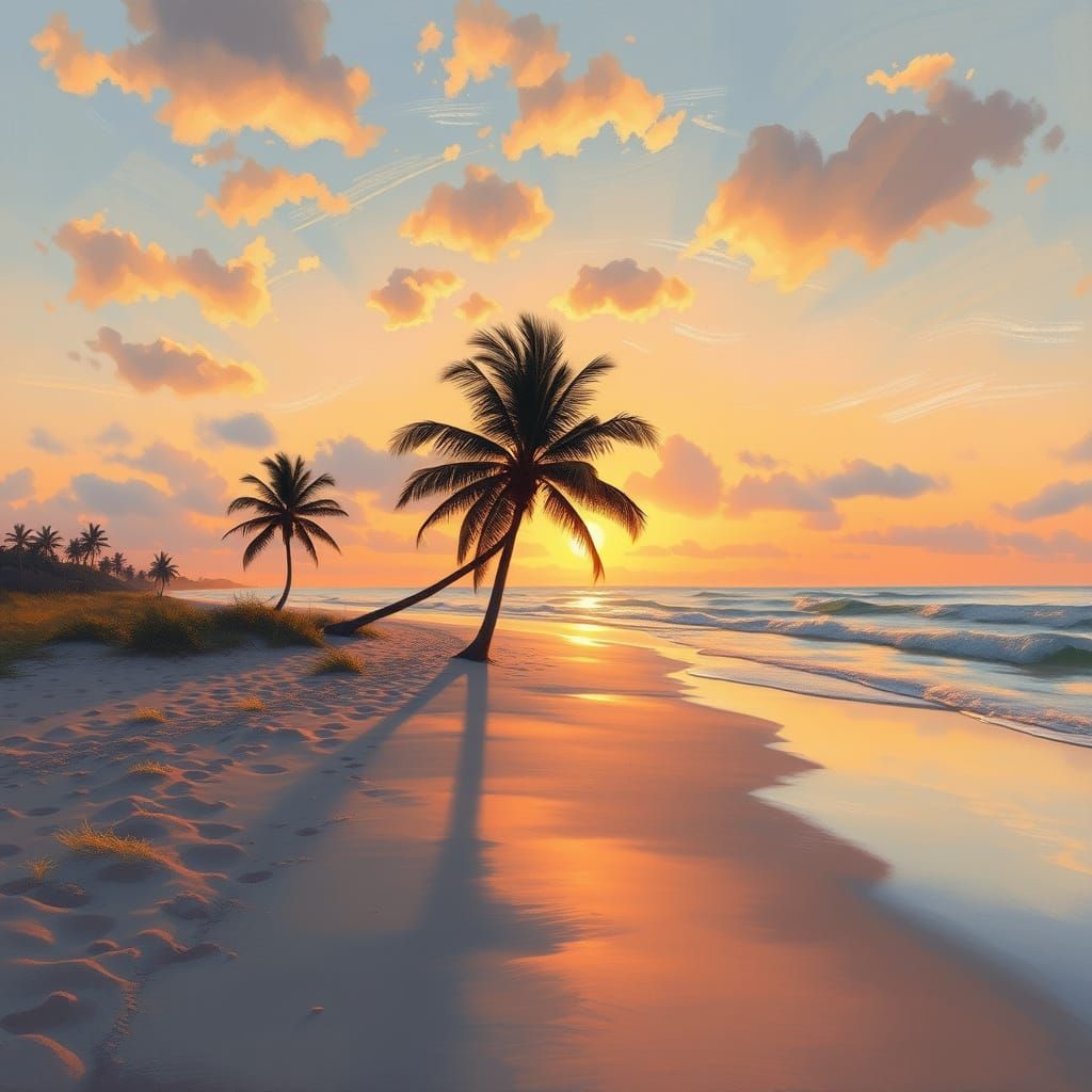 This image captures a serene beach scene at sunset, with warm golden light and soft brushstrokes evoking a tranquil atmosphere and vibrant colors reminiscent of impressionist masters.