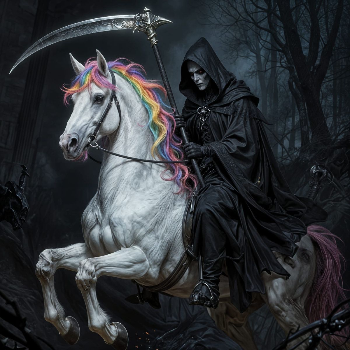 A realistic 4k image depicts the Grim Reaper on a unicorn with a rainbow mane, presented in a gothic artistic style.