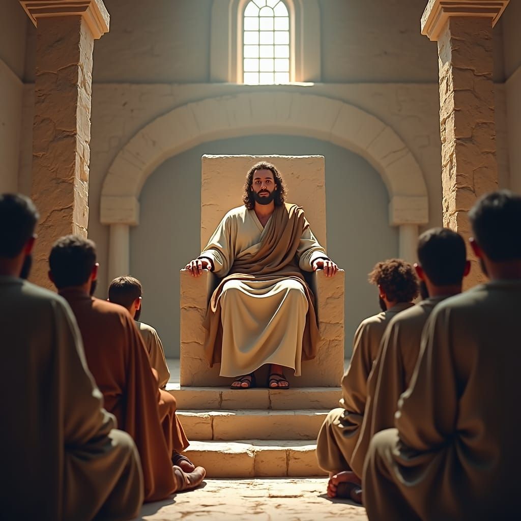This image shows Jesus preaching in the Synagogue of Nazareth. The scene is rendered with rich colors and intricate details, in a matte painting aesthetic reminiscent of fantasy concept art.