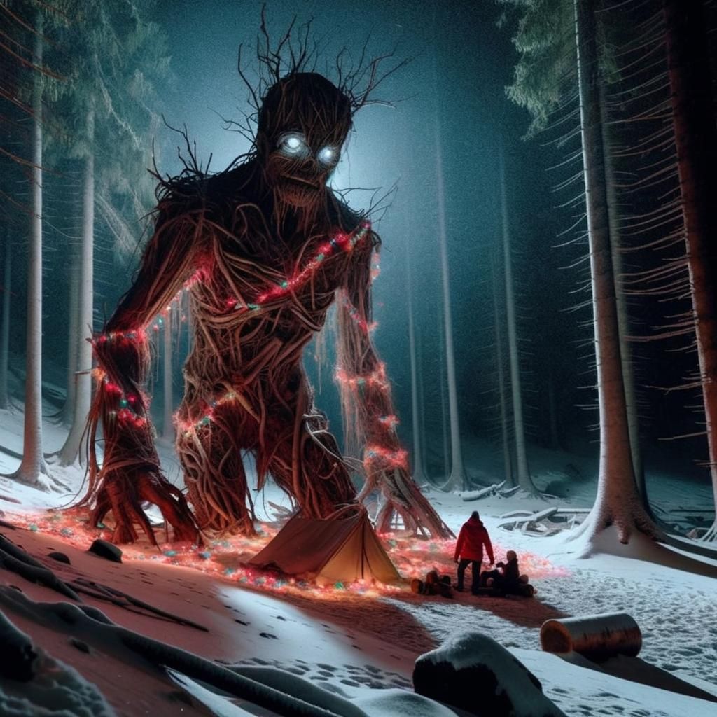 This image depicts a figure in a forest. The towering figure is made of twisted branches. Sparse holiday lights add an eerie glow to the dark scene.