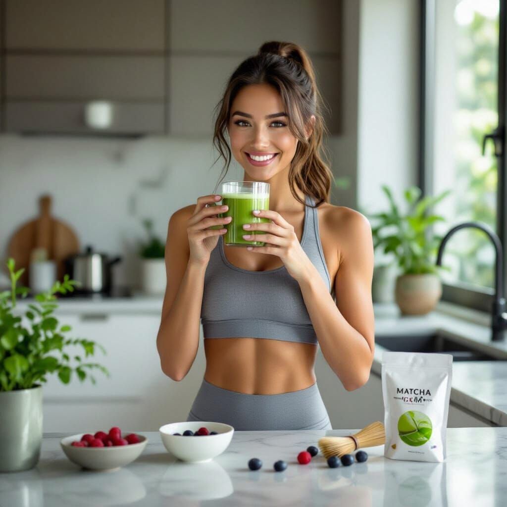 This image shows a smiling woman in activewear enjoying a matcha drink in her modern kitchen. The photo showcases a clean, minimalist design with natural lighting and a photorealistic aesthetic.