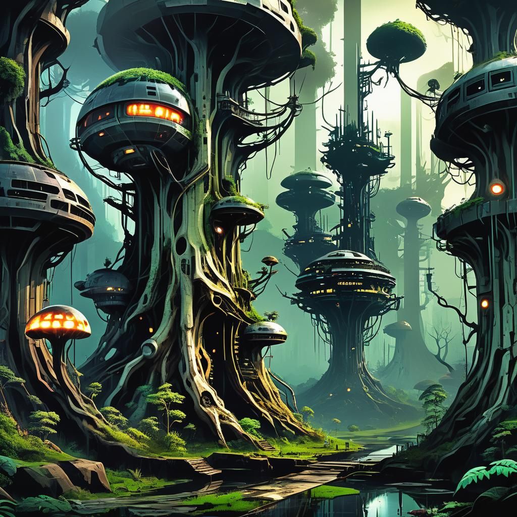 This image shows a bizarre teslapunk arcology deep within a forest. The surreal scene evokes a sense of unease and nightmare, blending technology and nature.
