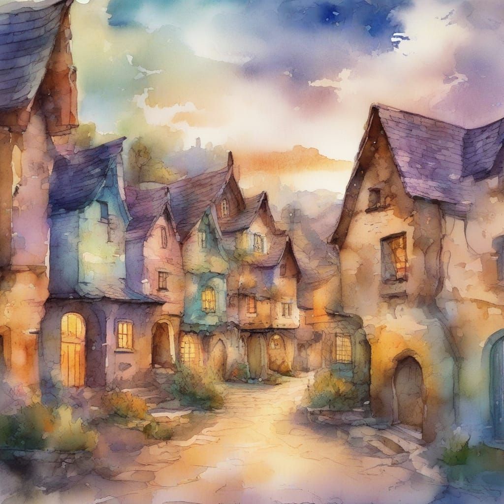 This enchanting village scene is rendered in watercolour ink with expressive brushstrokes and splatters, evoking a dreamy, ethereal atmosphere of iridescent neon twilight. Soft, tetradic colours of lavender, peach, mint, and powder blue dominate the scene, set amidst rustic stone cottages and cobblestone...