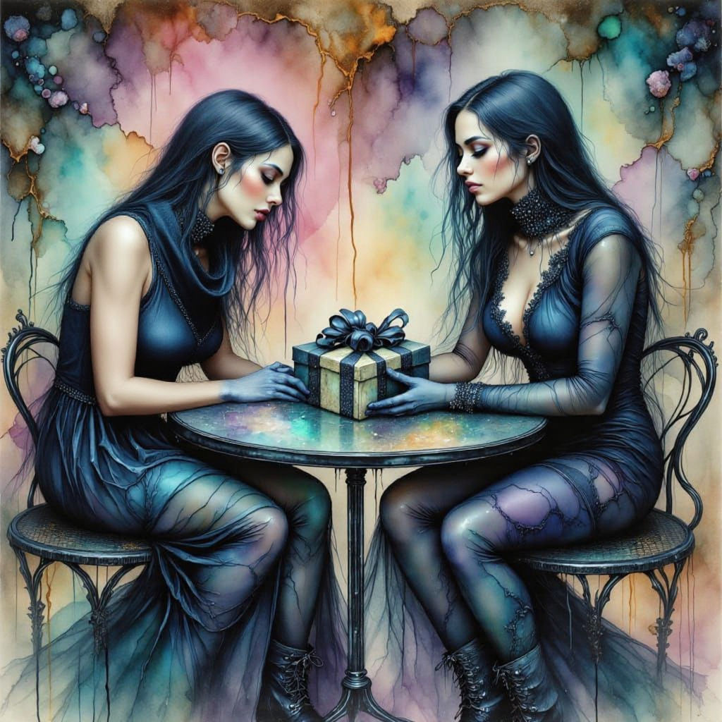 This image features two women in gothic attire at a haunted rose garden table. One gifts the other a birthday present, illuminated by an eerie glow, created with watercolor and alcohol ink techniques.