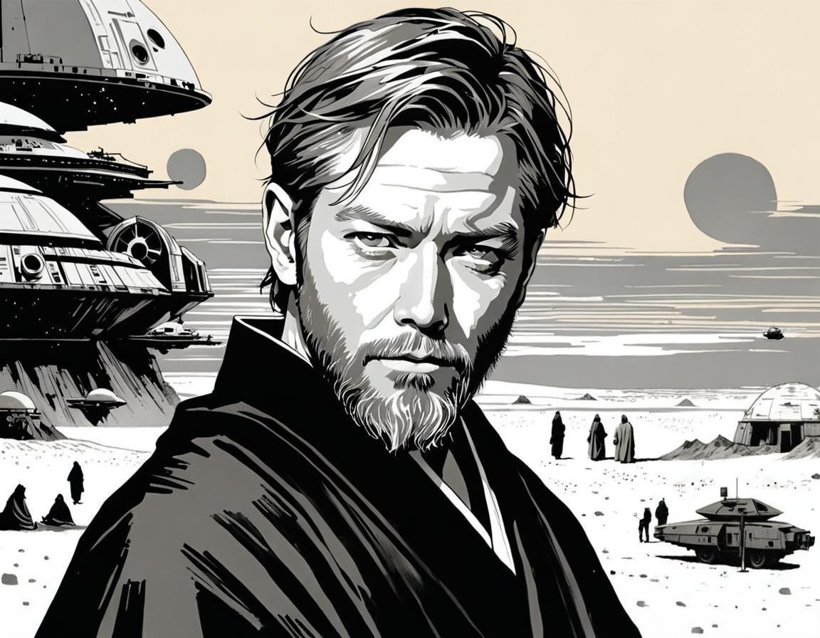 black ink portrait illustration of Obi-Wan Kenobi. Masterpiece, Elaborate_(Tatooine_background:1.3) Intricate, Insanely_Detailed, Art_by_Kim_Jung Gi, Gregory Crewdson, Yoji Shinkawa, Guy Denning, James Jean, Ink Drip, abstract art black and white fine details