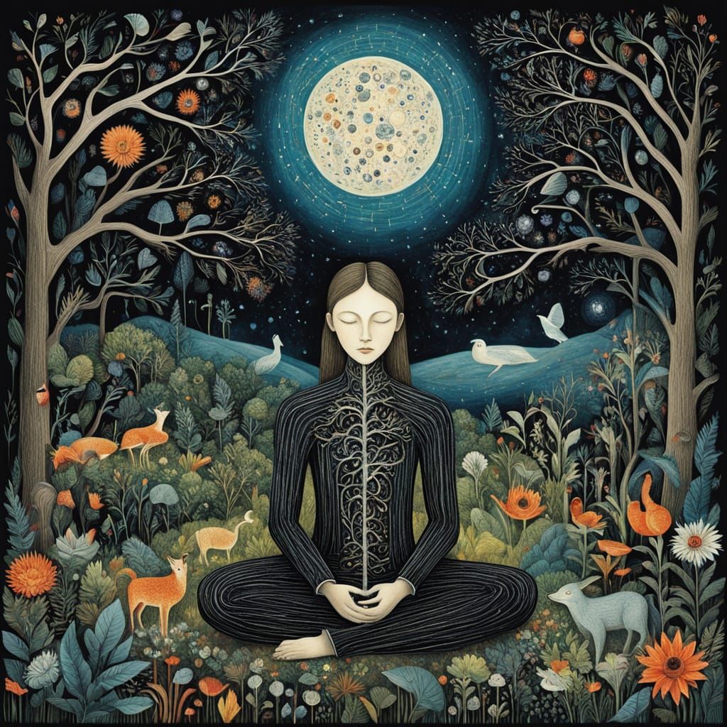 This digital artwork features a mesmerizing collage of glowing creatures, blending natural and cosmic elements. The central figure kneels amidst a textured network, serene landscapes, and abstract designs, symbolizing strength, resilience, and the pursuit of authenticity.