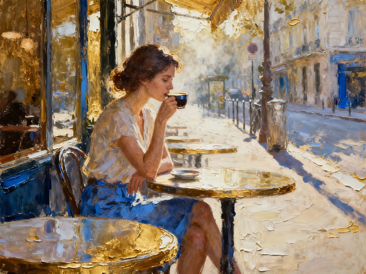 This image showcases a woman enjoying coffee at a sidewalk cafe. It features impressionistic light and urban views rendered with translucent wax for a textured, dimensional effect.