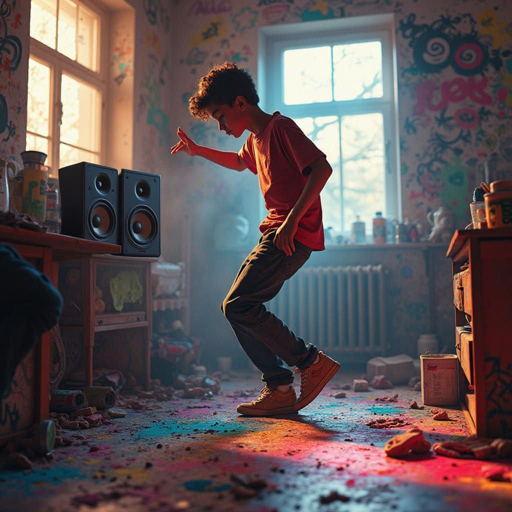 This image shows a young man dancing in a messy bedroom, listening to music from computer speakers. The portrait features dynamic lighting, intricate details, and a vibrant, colorful aesthetic inspired by street art.