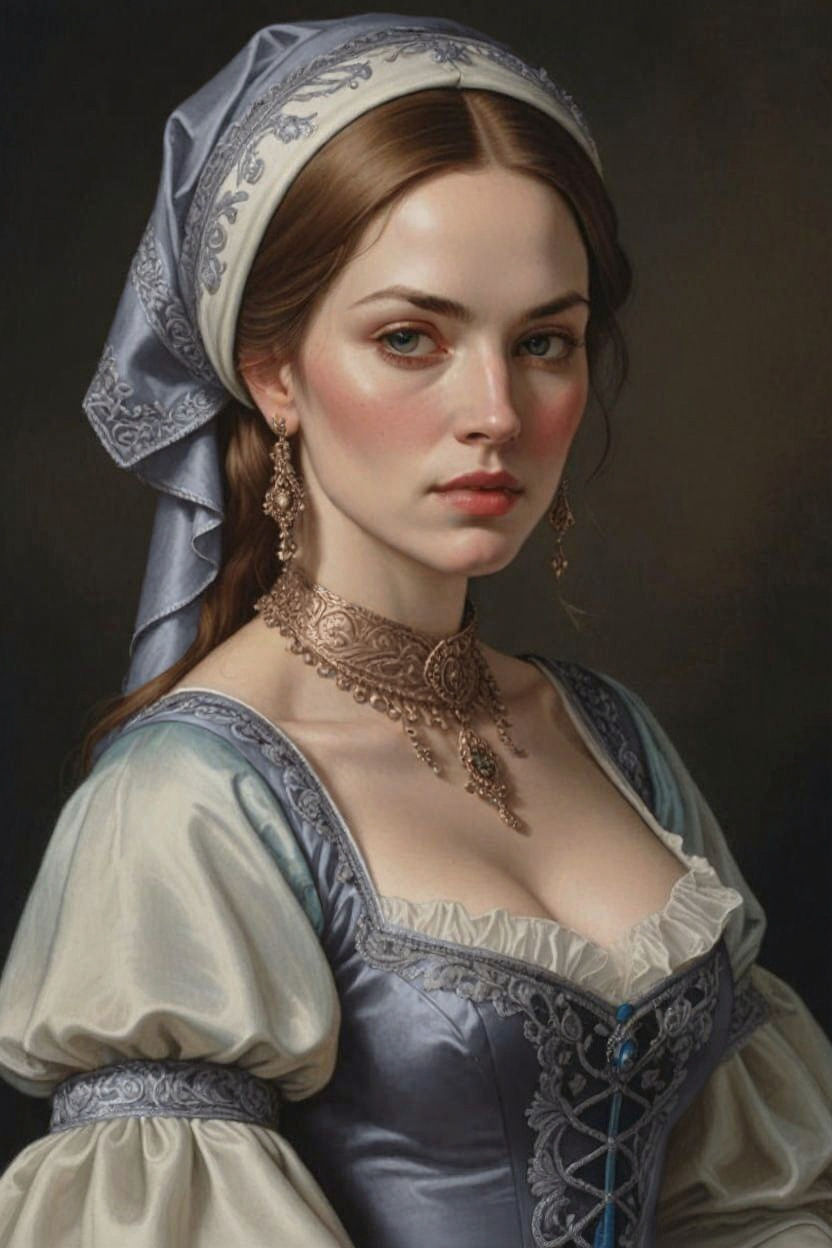 Grey blue dress, grey blue headscarf, a noble female, gentle face, long brown hair, Renaissance 17th century expensive grey blue dress clothing...