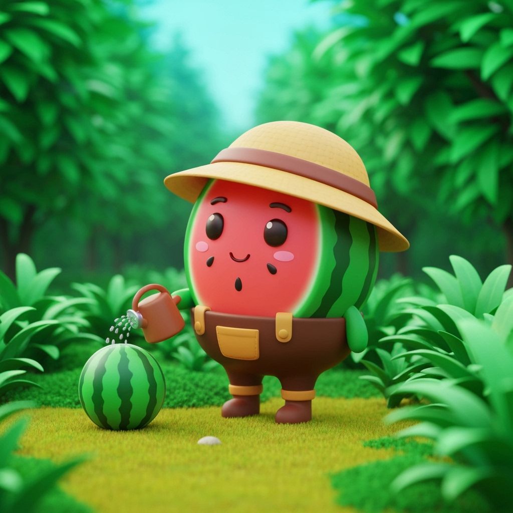 This image shows a cartoon watermelon farmer watering a baby watermelon in a vibrant green garden. The artwork has a bright, anime-inspired aesthetic with ambient occlusion and 3D rendering.