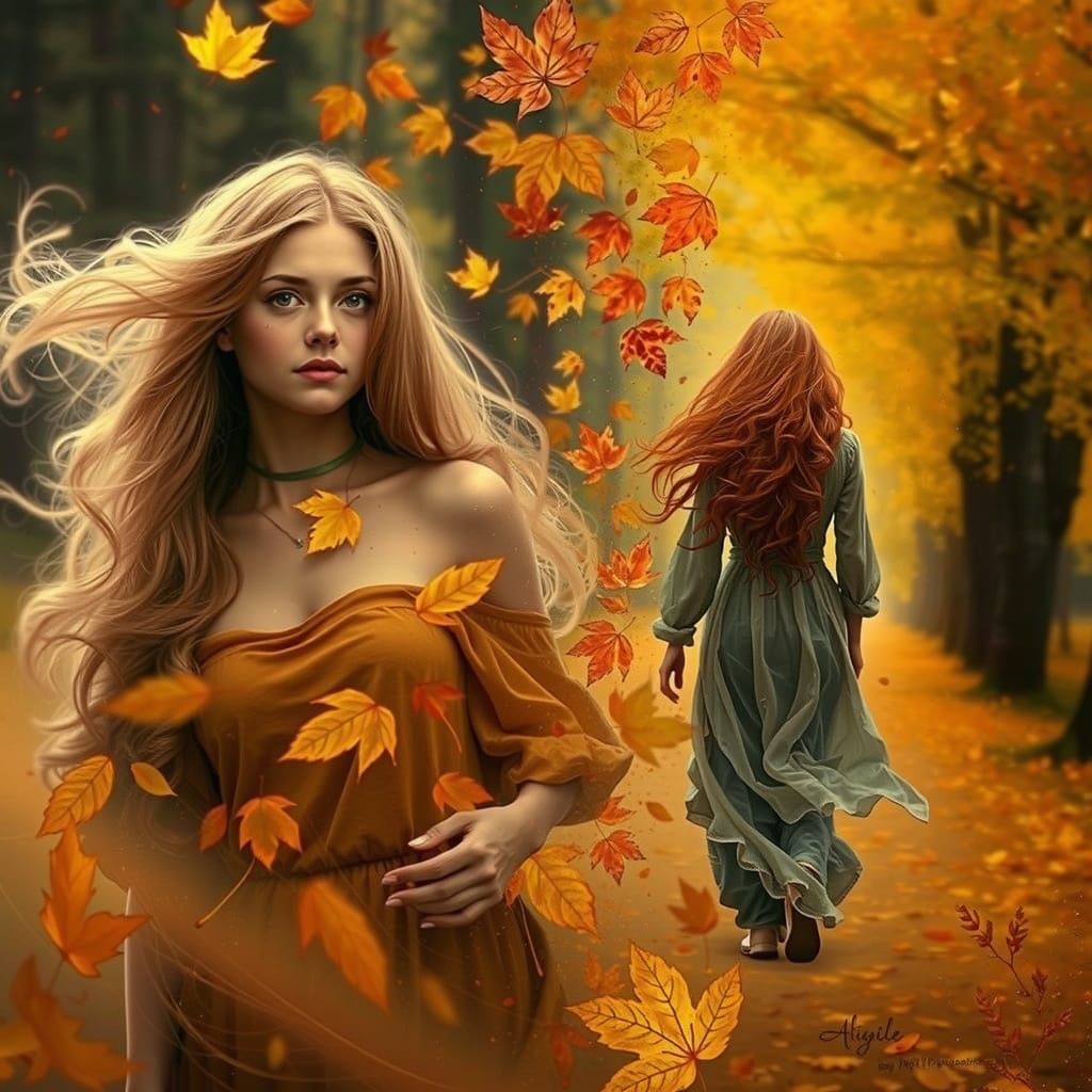 A photorealistic fantasy image of a woman with red hair in an ochre dress, surrounded by autumn leaves. Another woman walks a golden path in the background, rendered with delicate brushstrokes.