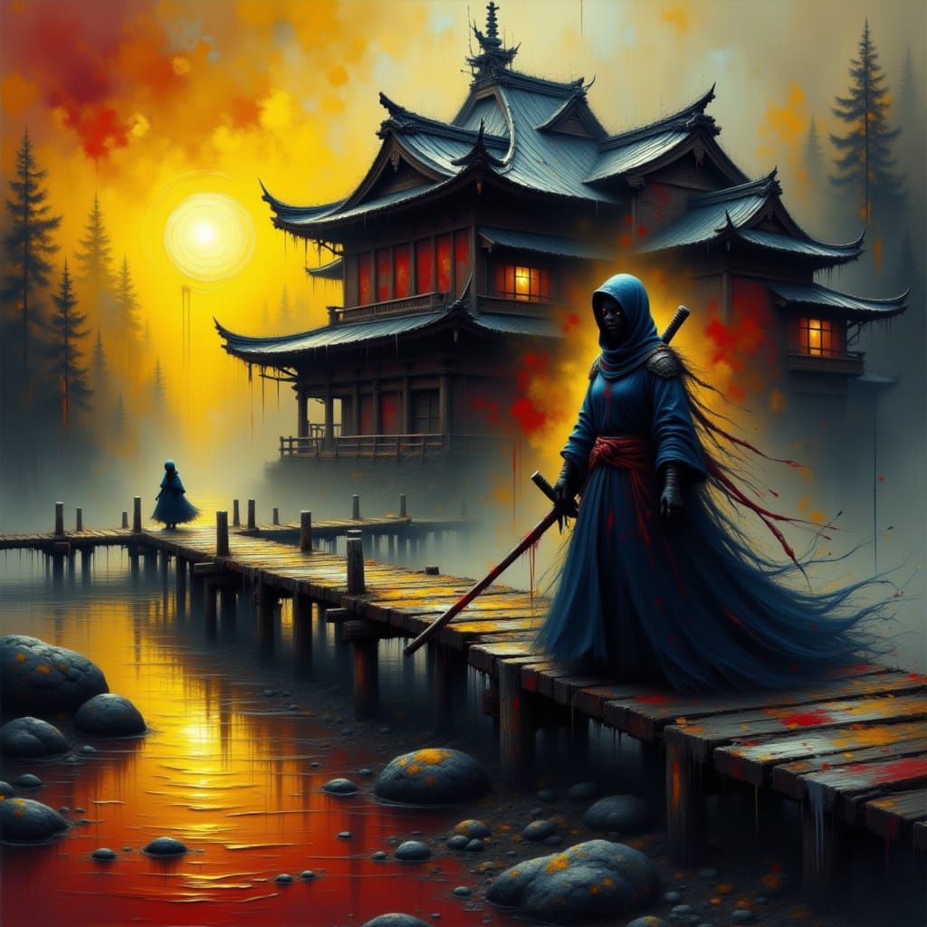 This image shows a masked female ninja standing near a vibrant red Torii gate, rendered with only blue, black, yellow, and red. The atmosphere is ominous and striking.