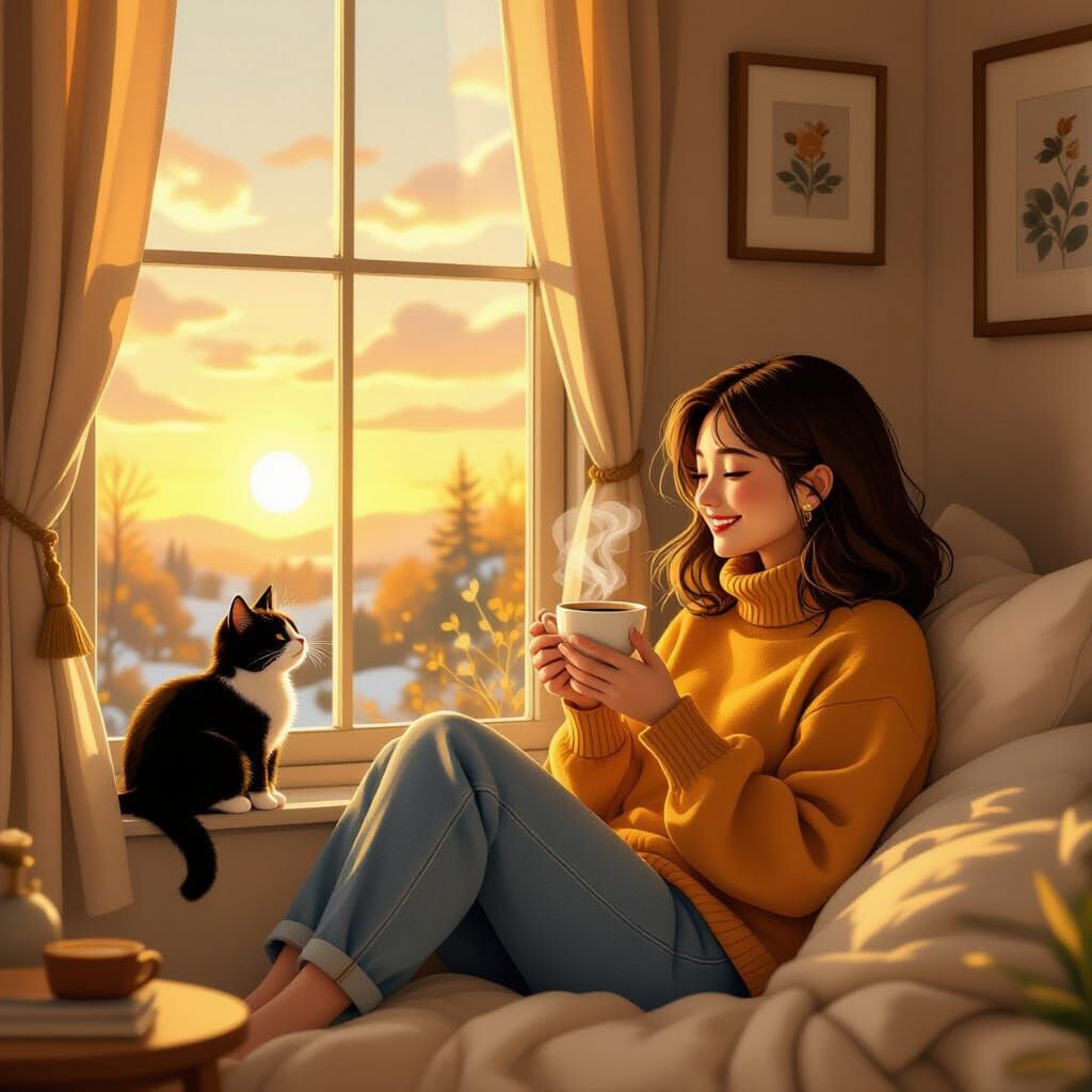A cozy scene of a person enjoying coffee at sunrise with their cat. The warm, inviting atmosphere is rendered with delicate lines and soft, golden light, reminiscent of classic storybook art.