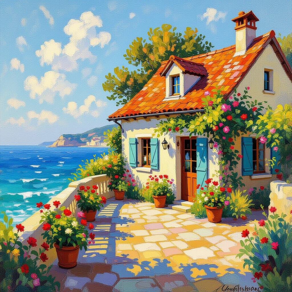 A vibrant coastal cottage with a sun-drenched terrace overlooking the sea. The image captures the charm of impressionism with colorful flowers and lush plants.