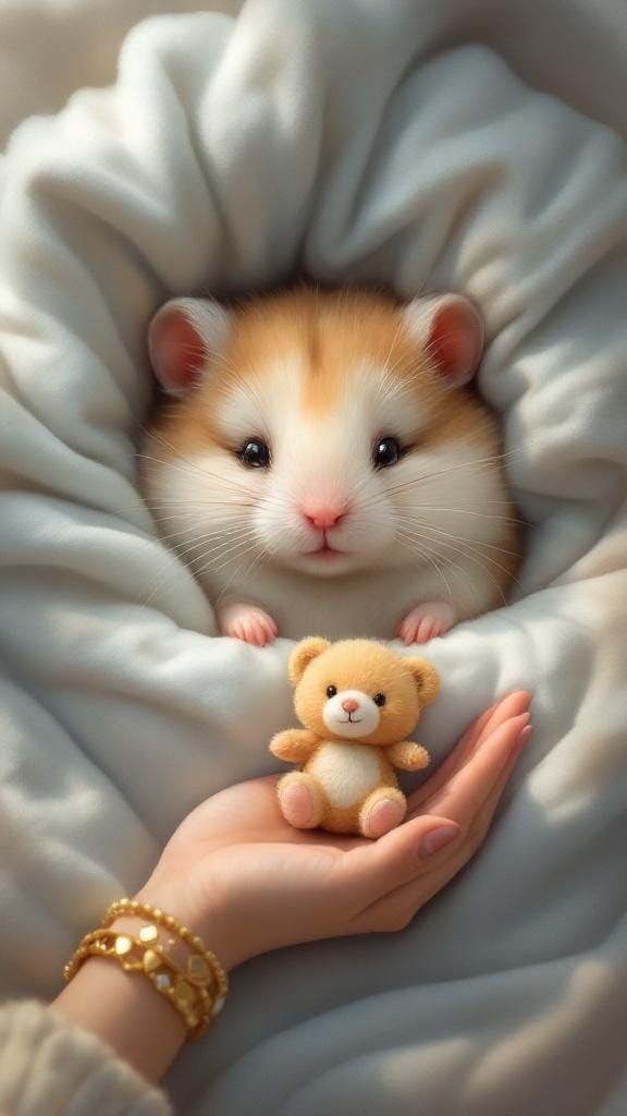 This image shows a fluffy hamster in a cozy bed being offered a tiny teddy bear by a woman's hand. It is rendered in a dreamy, heartwarming style.