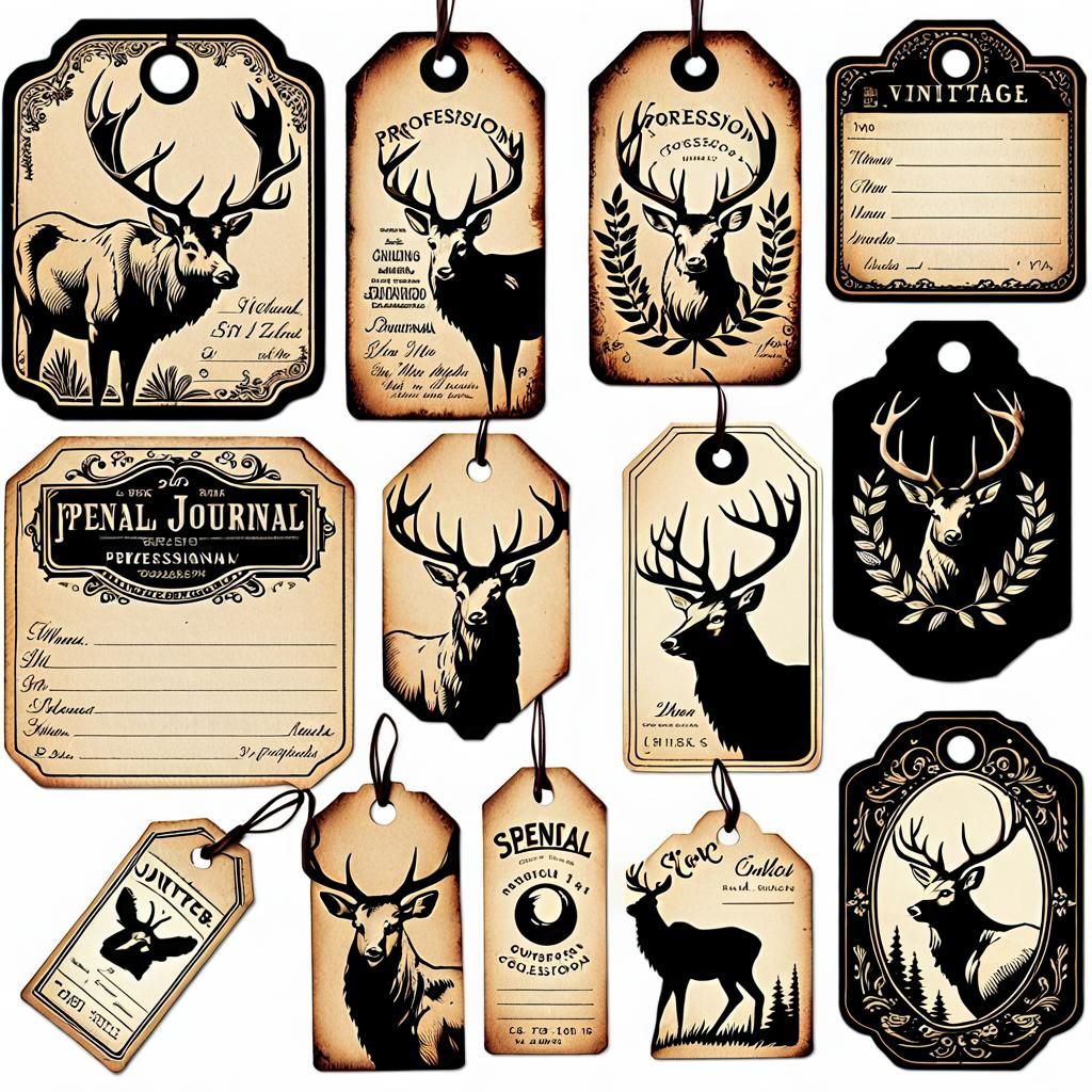 This image showcases a collection of vintage journal shipping tags. The tags feature distressed sketches of an elk and are decorated with intricate pen and ink drawings on vintage paper.