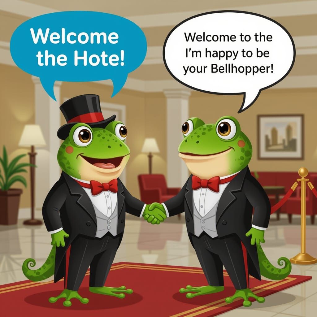 A charming frog dressed as a hotel bellhop greets a guest with a friendly smile and a warm welcome. This whimsical image captures a delightful scene.