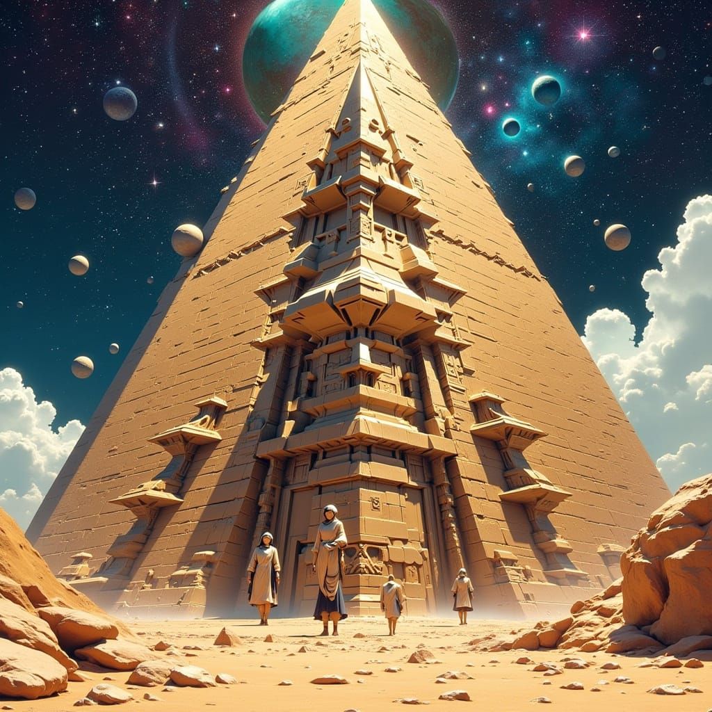 This image depicts a colossal anime woman monument on a desert planet, built with cyberpunk and ancient Egyptian aesthetics. Tiny people construct and inhabit the structure, with a vibrant space background.